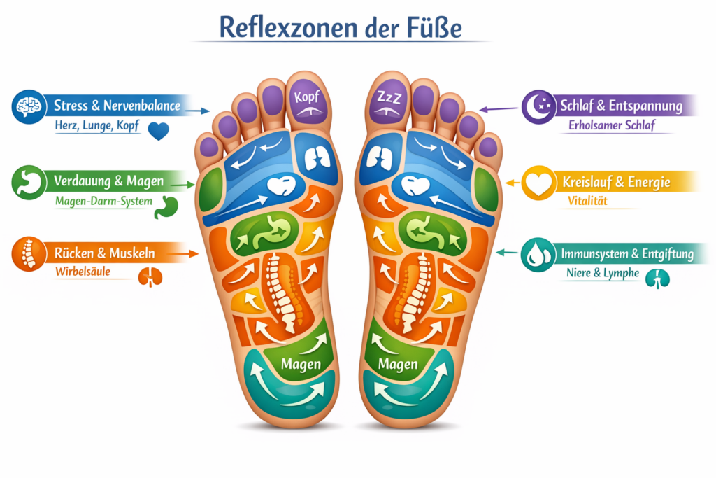 Das Bild zeigt eine Fußreflexzonenkarte, die aus der Reflexzonentherapie stammt. Diese Methode geht davon aus, dass bestimmte Punkte (Reflexzonen) an den Füßen mit Organen und Körperbereichen in Verbindung stehen. Durch Druck oder Massage dieser Zonen sollen die entsprechenden Organe oder Körperteile positiv beeinflusst werden – z. B. durch Entspannung, bessere Durchblutung oder Linderung von Beschwerden.